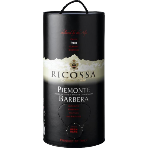 Karakteristisk for Barbera-druen er dens udtryksfulde frugt og relativt høje syre, der tilfører vinen et karakterfast bid med både kraft og styrke, dog uden at den af den grund mister finesse. Ricossa Barbera er en saftig, fyldig rødvin med tætpakket, mørk bærfrugt støttet af noter fra fadlagringen. Dette er en vin, man har lyst til at drikke i "store slurke" i kraft af dens rene, frugtige smag kombineret med en blid og behagelig eftersmag. Vinen anbefales at servere ved en temperatur på ca. 16-17 grader til middelkraftige kødretter, til en veltilsmagt pastaret med kærlig sovs eller som smagfuld hyggevin. Den smukke emballage gør sig ikke blot godt ved spisebordet – giv den også som en præsentabel værts-/værtindegave. I lighed med boksvine indeholder den en selvvakuumerende pose, så vinen holder sig frisk i nogle uger efter åbning.