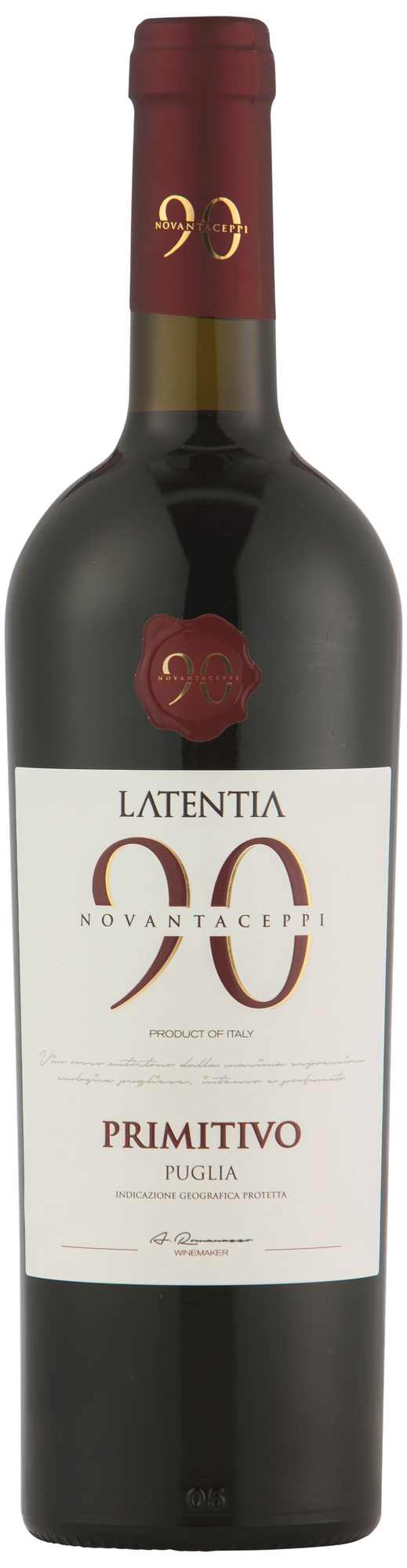 Primitivo Novantaceppi 90 Latentia 2020 Outstanding glas vin, som er en nyfortolkning af den lækre robuste og fyldige Primitivo, med en let og innovativ smag og dufttoner af blommer og mørk chokolade. Vinen repræsenterer en helt ny måde at drikke Primitivo, der er behagelig fremfor tung og kompleks.