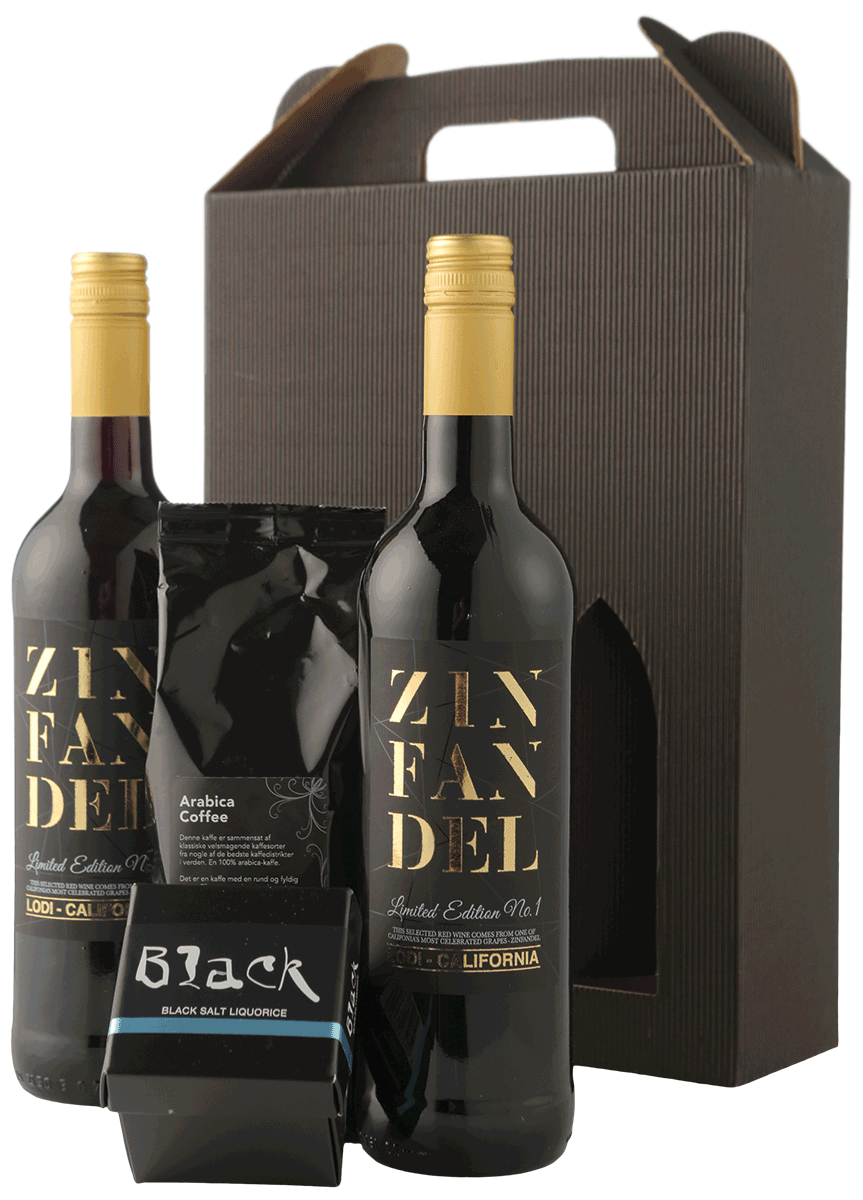 Gavekasse No. 50 * CALIFORNISKE VINE, LAKRIDS OG KAFFE. Gaveæsken indeholder: 2 fl. ZINFANDEL Lodi Limited Edition No. 1 (rødvin fra Californien) / 1 æske Finsk salt lakrids / Coca kaffe Java 175 g. Pakket i sort gaveæske.