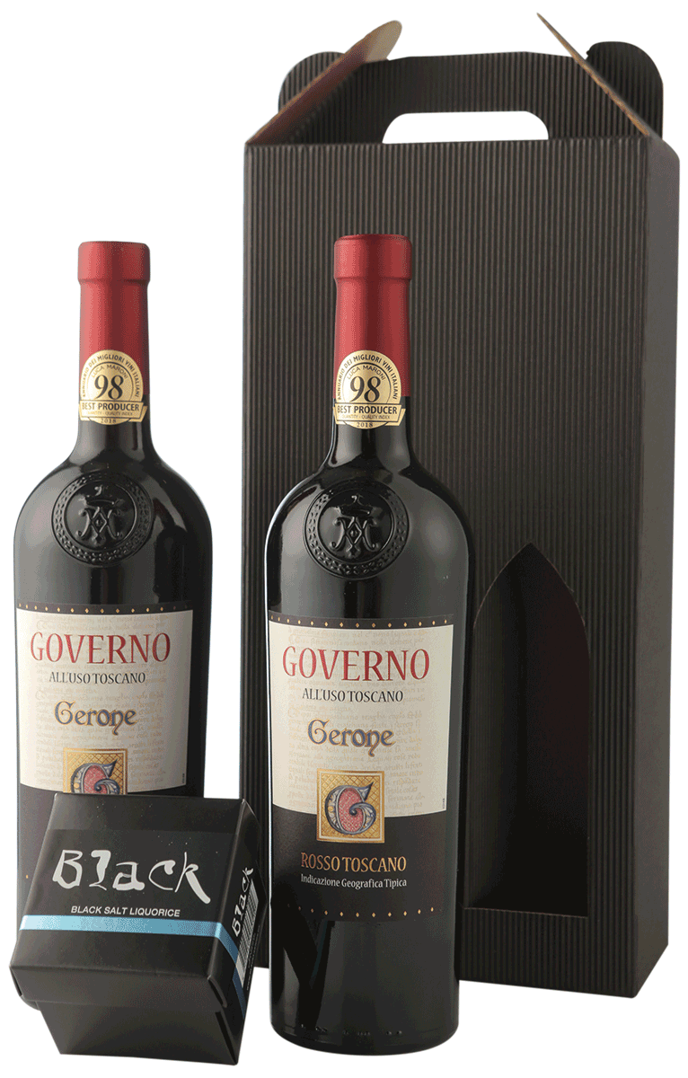 Gavekasse No. 51 * ITALIENSKE VINE OG LAKRIDS. Gaveæsken indeholder: 2 fl. GOVERNO All Uso Rosso Toscano IGT - Gerone (rødvin fra Toscana i Italien) / 1 æske Finsk salt lakrids. Pakket i sort gaveæske.