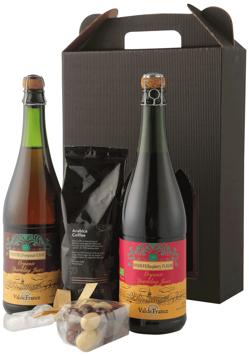 Gavekasse No. 52 * ALKOHOLFRI CIDER - KAFFE OG CHOKO NØDDER. Gaveæsken indeholder: 1 fl. Cider Granatæble u/alkohol Økologisk - Val de France 75 cl. / 1 fl. Cider Hindbær u/alkohol Økologisk - Val de France 75 cl. / Coca Kaffe 250 g / Blandede chokonødder og mandler. Pakket i sort gaveæske.