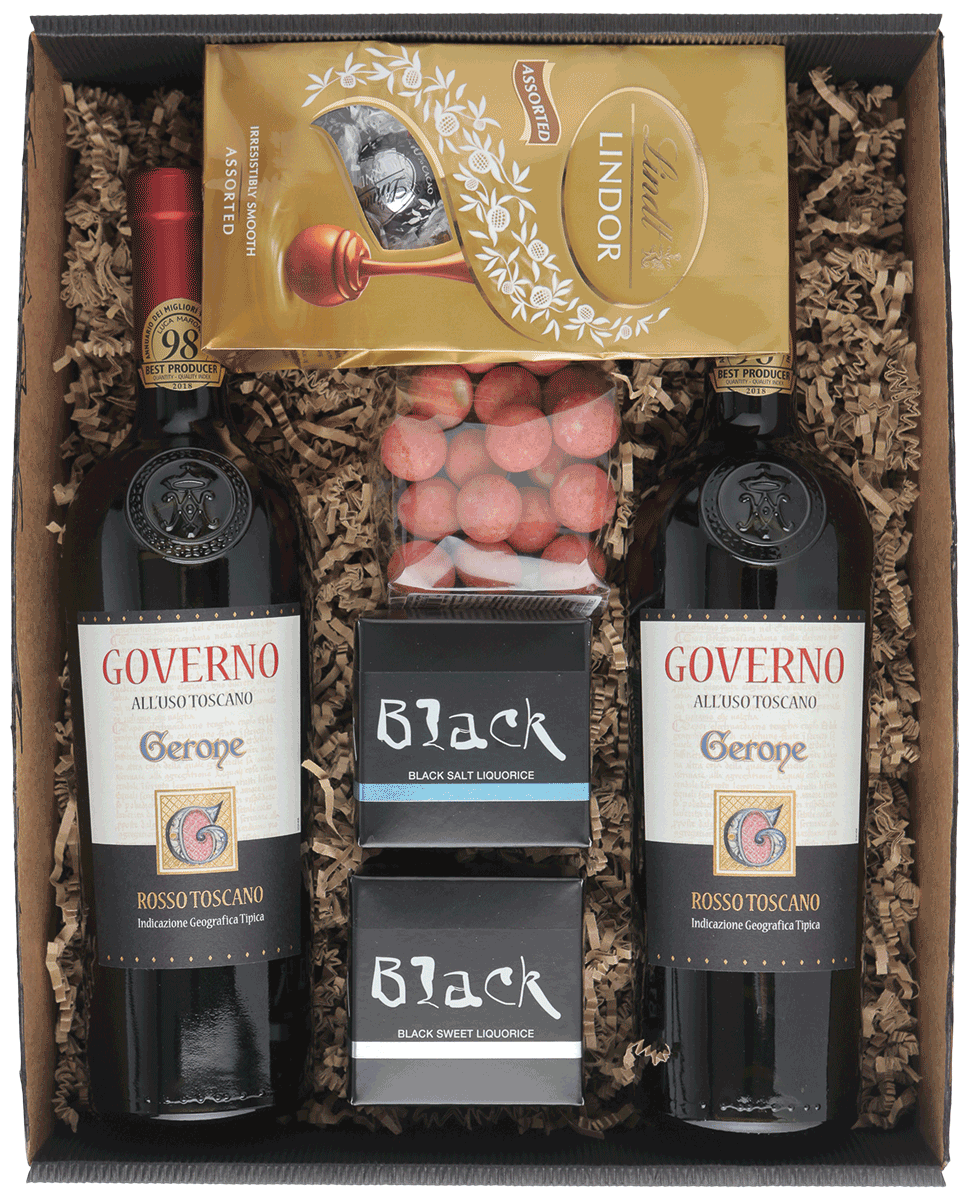 Gavekasse No. 53 * ITALIENSKE VINE - CHOKOLADE OG LAKRIDS. Gaveæsken indeholder: 2 fl. GOVERNO All Uso Rosso Toscano IGT - Gerone (rødvin fra Italien) / Lindt Lindor Chokoladekugler 137 g / Almuegaardens chokolade-lakrids kugler med hindbær 120 g / 2 æsker finsk lakrids - sød og salt. Pakket i flot, sort gaveæske med rude.
