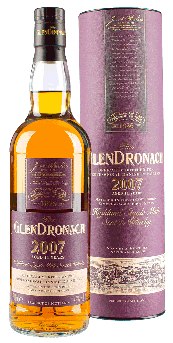 Højlandsdestilleriet GlenDronach er et af Skotlands ældste, og det kan trække en spændende historisk linie til de allerførste licenser der blev udstedt til legal destillering i højlandet. Blandt stifterne af Glendronach var James Allardes, der var protegé af den adelsmand, der var direkte ansvarlig for lovgivningen i 1823. GlenDronach blev opbygget få år efter i 1825 lige uden for byen Huntly. Siden da har destilleriet været nedbrændt, skiftet ejere et utal af gange og kapaciteten er blevet udvidet. GlenDronach var blandt de sidste til at indstille gulvmaltningen og det var det allersidste skotske destilleri, der afskaffede den direkte opvarmning af kedlerne med kul.
