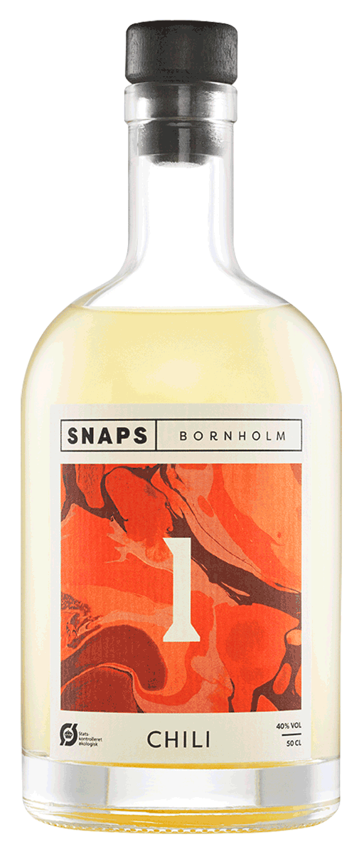 Snaps Bornholm No 1 Chili 50 cl. er økologisk kvalitetssnaps tilsat Chili. På de to Caribiske øer Trinidad og Tobago finder man den pikante chili Trinidad Moruga Scorpion samt andre spændende chilisorter. I 2012 blev Trinidad Moruga Scorpion - med sine hæsblæsende 2,009,231 scoville - kåret som verdens stærkeste chili. Navnet Scorpion henviser til chiliens spids, der siges at kunne stikke præcis som brodden fra en skorpion. Snaps Bornholm har bragt denne chili og andre chili sorter med hjem Bornholm og vores mildere klima, hvor de tilsættes denne chilisnaps og er med til at give varme.