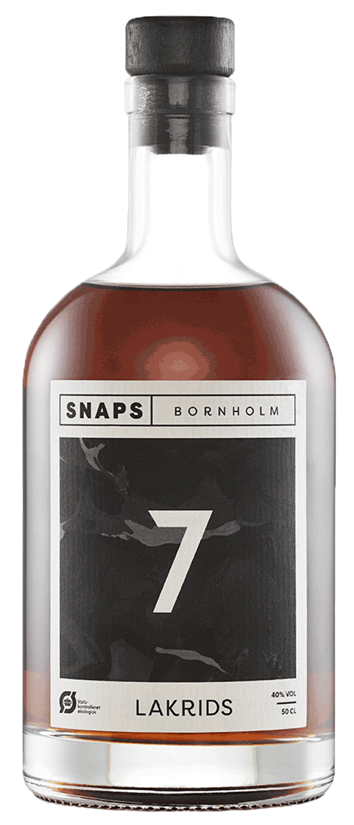 Snaps Bornholm No 7 Lakrids 50 cl. er økologisk kvalitetssnaps tilsat lakrids. Renæssancen for lakrids er stadig i fuld sving. I Danmark har vi længe gnasket på den sorte lakridsmasse, der skabes fra en rod, der hovedsageligt trækkes ud af jorden ved Middelhavet, Mellemøsten og Asien. Snaps Bornholms lakridssnaps har bid. Den indeholder en yderst dyb lakridssmag, der fylder længe i munden.