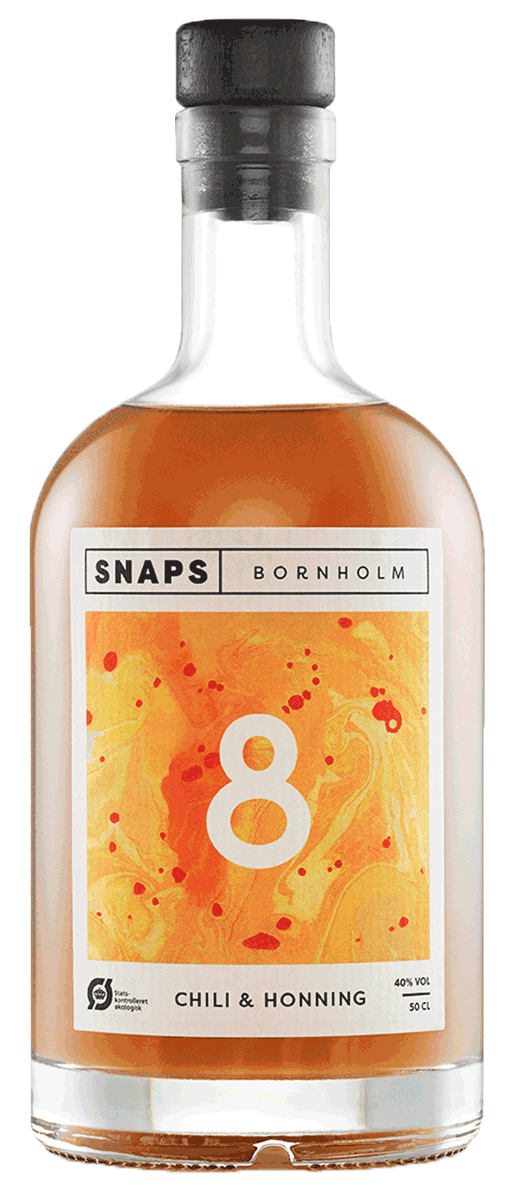 Snaps Bornholm No 8 Chili & Honning 50 cl. er økologisk kvalitetssnaps tilsat chili og honning. Den traditionelle bornholmske honningsyp har fået et nyt lille twist. Blandingen af snaps og honning har i århundreder været en fast bestanddel af bornholmsk kultur, og en populær delikatesse blandt både lokale og besøgende. Snaps Bornhom har tilsat en knivspids chili, hvilket resulterer i en sød og rund snaps, der slutter med et lille bid.